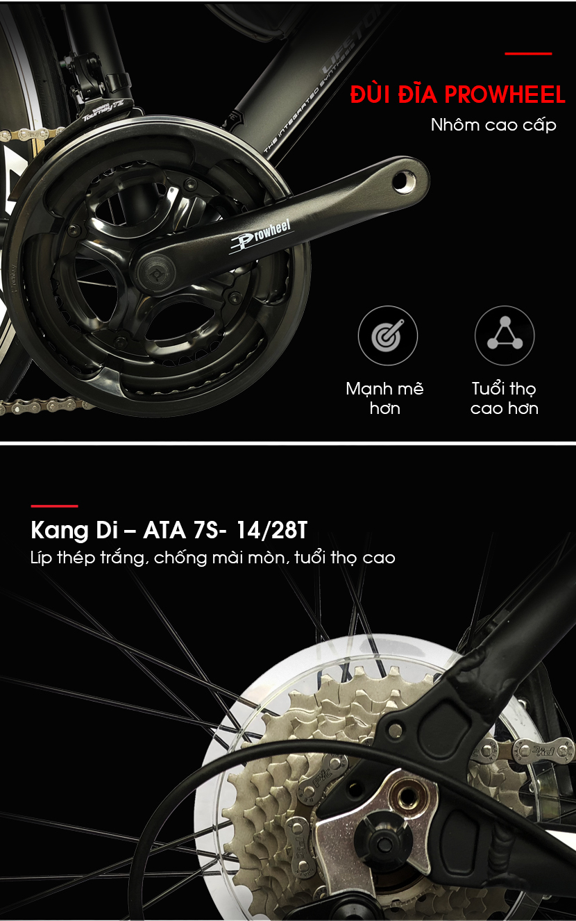Xe sử dụng đùi đĩa Prowheel cao cấp, líp thép trắng, trống mài mòn, tuổi thọ cao